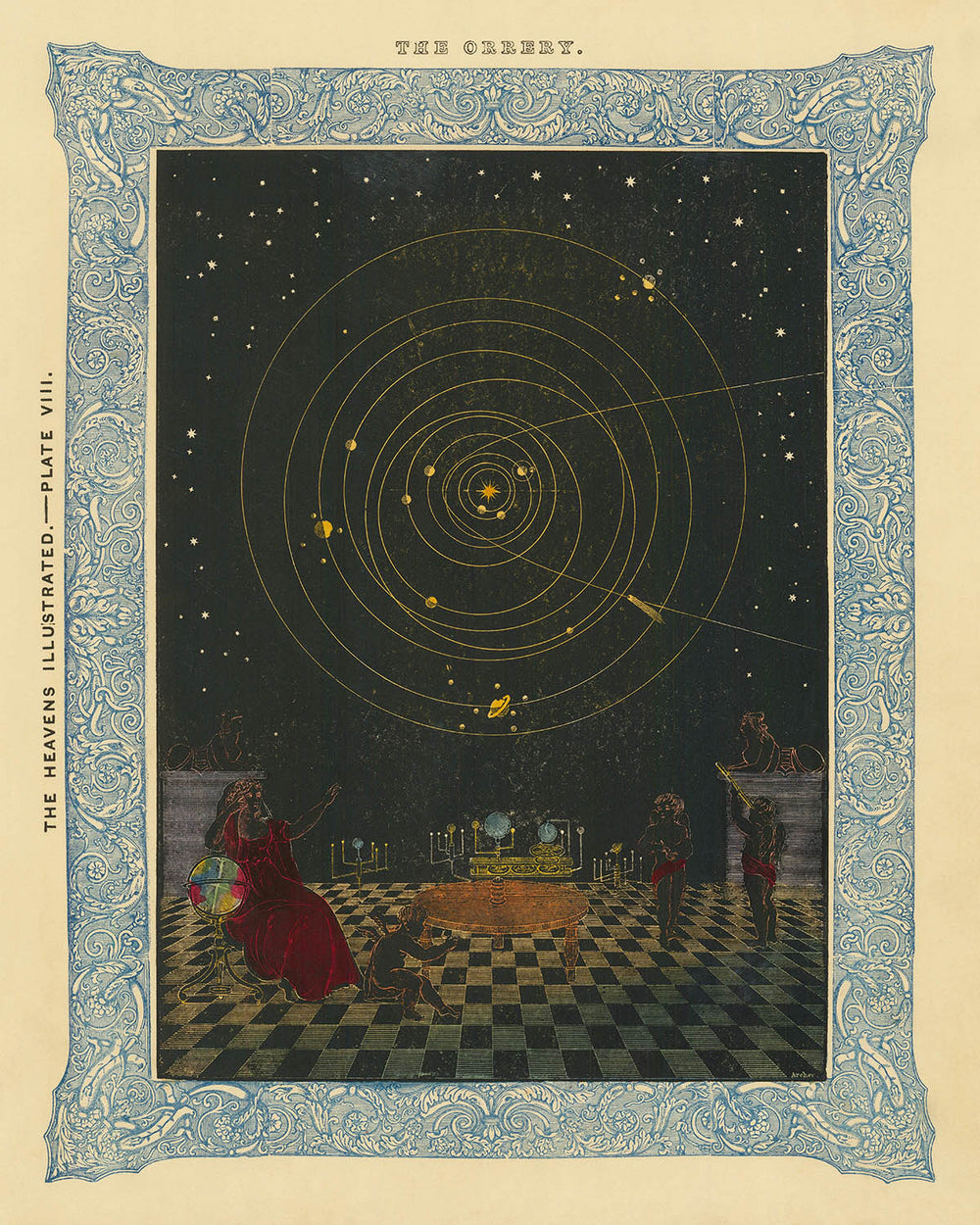 The Orrery by Duncan Bradford is a mesmerizing handcoloured engraving first published in 1837, offering a captivating glimpse into the celestial understandings of the 19th century. This dynamic illustration portrays a room guarded by two sphinxes with an orrery, accompanied by a woman and three cherubim attendants. In the backdrop, the solar system unfolds, detailed with Mercury, Venus, Earth with its moon, Mars, the asteroids, Jupiter with four moons, Saturn with seven moons, and Uranus with six moons. Originally published in "The Wonders of the Heavens" in Boston and engraved by James Archer and George W. Boynton, this piece combines artistic brilliance with scientific exploration.